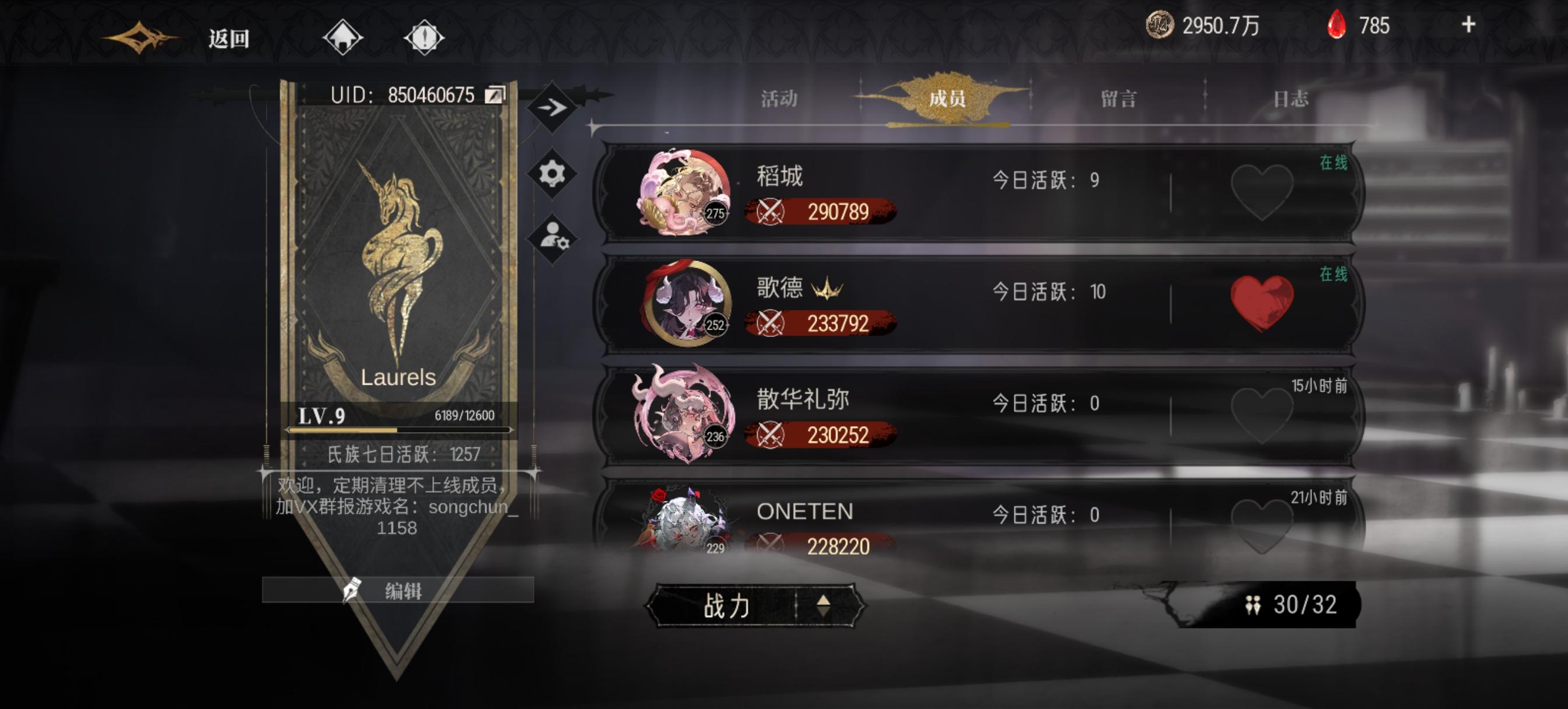 一个位置 族世有大佬 族世平均战力24万以上 加群留位置 群内氛围好 全员活跃20万以上战力可直接申请id 105119747 vx gsi1112