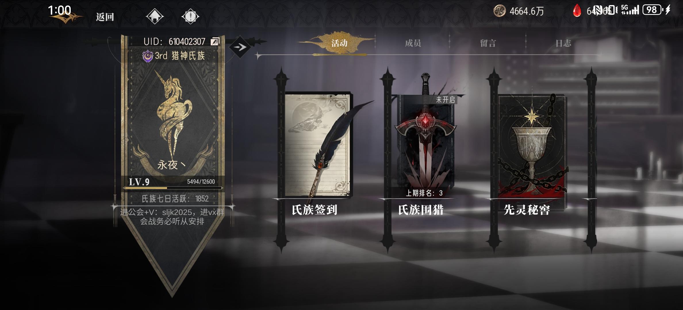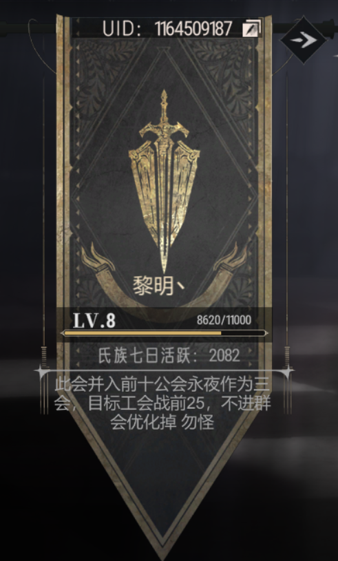 可以摆烂随便出刀,每天上线做个任务混混即可。目前有4个位置,欢迎工作繁忙,又不想被所谓的公会束缚有什么特定要求还要按顺序出刀等,可以建立微信群聊聊天,吹吹牛皮哈哈哈哈