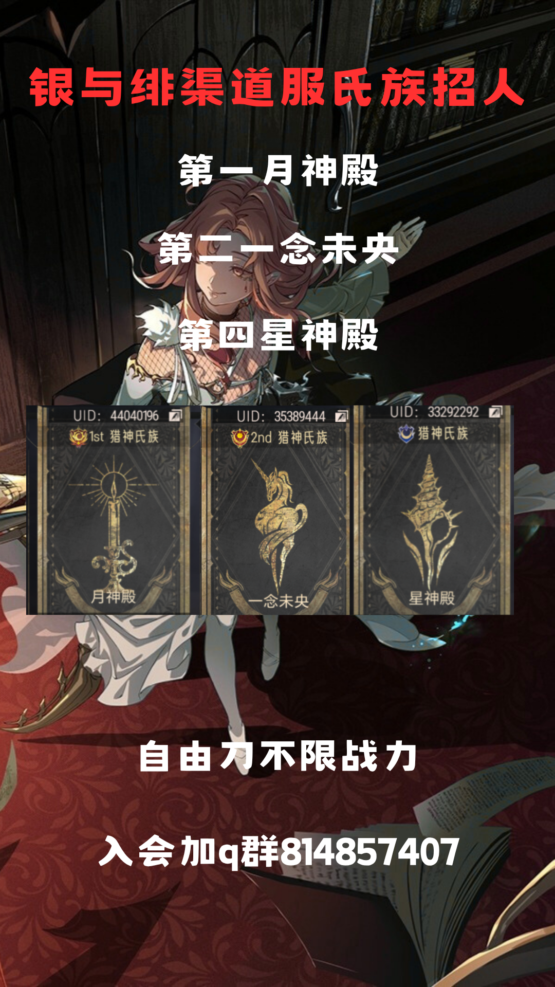 欢迎全部的活跃玩家,不论战力,心动的都可以来群里看看~氏族微信群QQ群可自由选择😚有耐心长老答疑解惑🤓#银与绯