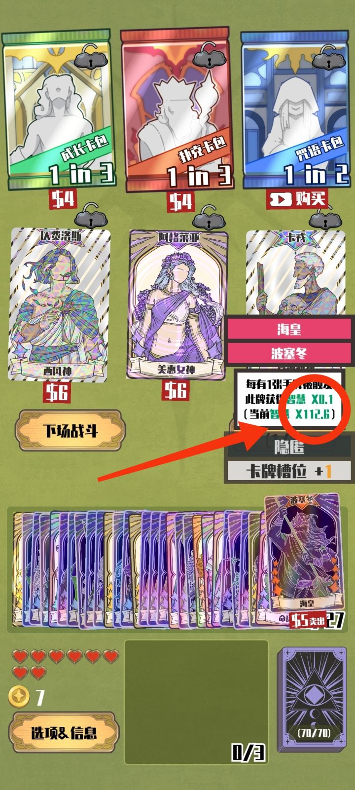 省流版看前二张图,按照顺序来最好详细文字版:核心是4张命运女神,1张医神,把血锁死,这样就能和超长血条的BOSS死磕了。战斗主要是靠海皇叠珍珠牌,叠多了智慧多,伤害高,最后的BOSS也就一两下的事。重复的牌可以先锁一张你想要的,比如命运女神。然后一直刷新,可以刷出重复的,这个就要看广告了。我是刷出了两张,第三张太难刷了,就用咒语牌复制了一下。开局一直刷这张命运女神,不要选