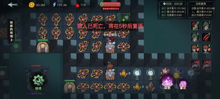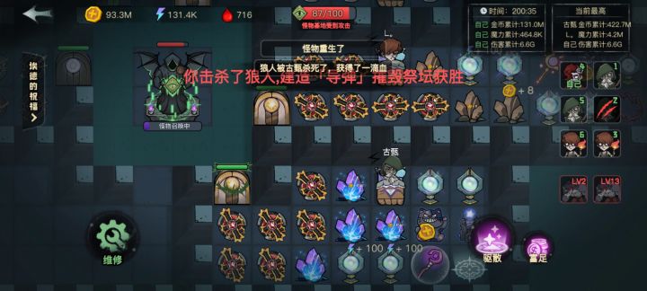 时间来到30分钟,怪物已经从无法靠近就被灭杀,变成了可以敲门了,由于我所有东西都是满级无法提升,为了避免阴沟里翻船,提前建造了满级炮塔摧毁雕像,看广告选奖励我个人觉得选(随机获得一个建筑)最好,运气好的话可以开出等级高的矿石或者能源水晶,开局直接起飞,强力压制,对了弹药库,和攻速阵法也是必备的,那个魔法药水攻击怪物可以偷钱也挺好用的有位置可以试一下。
