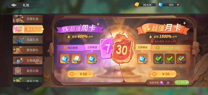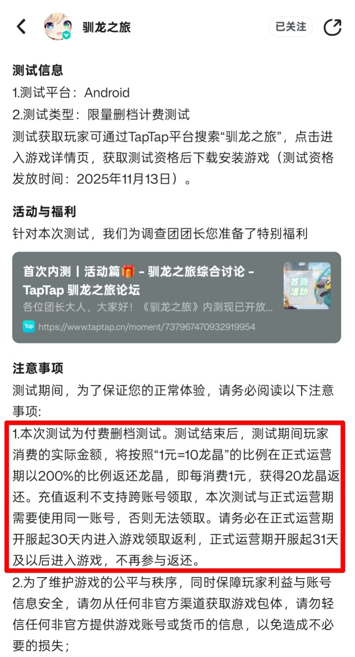 先上图图1为这次首测的氪金返还规则1元=10龙晶 200%返还。图2-7为各种通行证月卡订阅,加上已经消失的首充6元总共是6+30+30+30+30+68+68=262。按照图1的返还规则就是262×10×2=5240龙晶,公测只返还5240龙晶。按照1000龙晶10抽的价格,公测只返还只有50抽+240龙晶。因为钻石不能用于买礼包所以按抽卡算。公测只需要花68买图6的礼包就能获得3300
