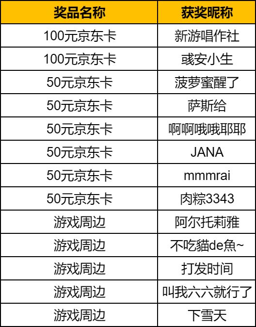 亲爱的玩家们,本次活动已经圆满结束啦,感谢大家的热情参与~现在就为大家公布本次活动的获奖名单~恭喜以上玩家!请获奖者在1月13日12点前私信版主【深圳王也(ID:675908111)】提供信息以便我们发放奖励。领奖小tips:1. 获得【京东卡】奖励的玩家请提供【接收奖励的邮箱】;2. 获得【游戏周边】奖励的玩家请提供【姓名,电话,地址】;3. 私信前请先关注版主账号【深圳王也(ID:6