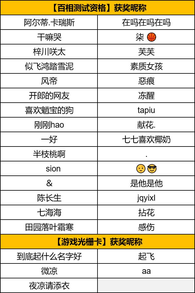 亲爱的玩家们,本次活动已经圆满结束啦,感谢大家的热情参与~现在就为大家公布本次活动的获奖名单~恭喜以上玩家!请获奖者在6月22日18点前私信版主【深圳王也(ID:675908111)】提供信息以便我们发放奖励。领奖小tips:1. 获得【百相测试资格】奖励的玩家请提供【获奖账号(QQ号/微信号),设备(安卓/苹果)】;2. 获得【游戏光栅卡】奖励的玩家请提供【姓名,电话,地址】;3.