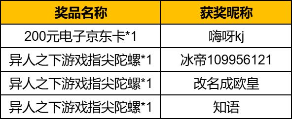 亲爱的玩家们,本次活动已经圆满结束啦,感谢大家的热情参与~现在就为大家公布本次活动的获奖名单~恭喜以上玩家!请获奖者在10月8日12点前私信版主【深圳王也(ID:675908111)】提供信息以便我们发放奖励。领奖小tips:1. 获得【京东卡】奖励的玩家请提供【接收奖励的邮箱】;2. 获得【游戏周边】奖励的玩家请提供【姓名,电话,地址】;3. 私信前请先关注版主账号【深圳王也(ID:6