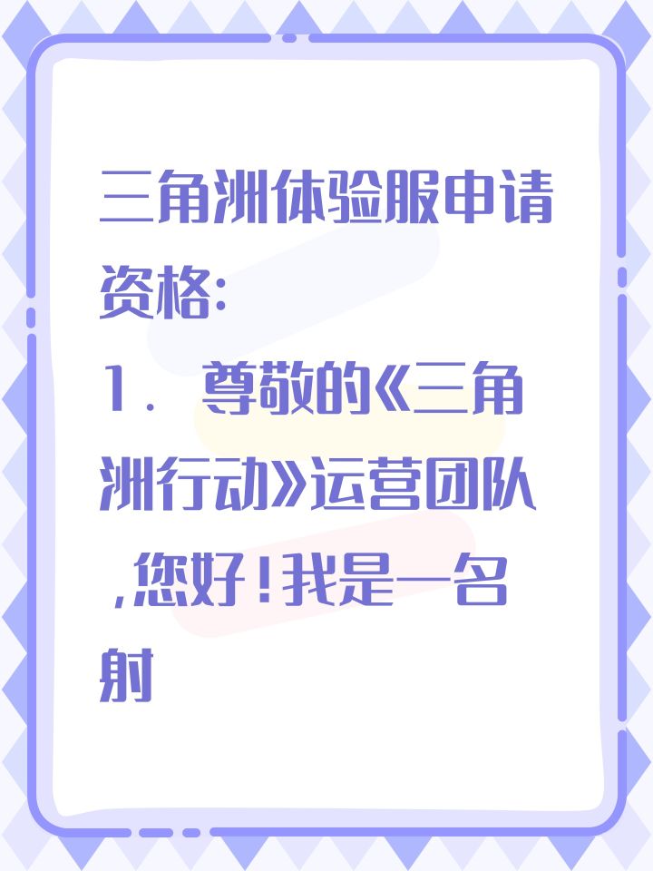 申请体验服资格: 尊敬的三角洲行动官方人员,您们好。我对三角洲行动这款游戏有着很大的兴趣,所以在在体验服资格招募第一天就填写了问卷,想要获得一个体验服的资格。接下来谈谈我对三角洲行动这款游戏的兴趣所在,首先他是一款硬核的射击游戏,游戏画面真实,剧情完善,相对来说超越了很大一部分射击类手游。其次,他在行动上加上摸金撤离这个形式,给游戏带来了更多的乐趣。最后也就是我在手机端所看到的游戏的画质及操作手