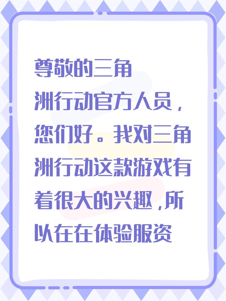 申请体验服资格: 尊敬的三角洲行动官方人员,您们好。我对三角洲行动这款游戏有着很大的兴趣,所以在在体验服资格招募第一天就填写了问卷,想要获得一个体验服的资格。接下来谈谈我对三角洲行动这款游戏的兴趣所在,首先他是一款硬核的射击游戏,游戏画面真实,剧情完善,相对来说超越了很大一部分射击类手游。其次,他在行动上加上摸金撤离这个形式,给游戏带来了更多的乐趣。最后也就是我在手机端所看到的游戏的画质及操作手