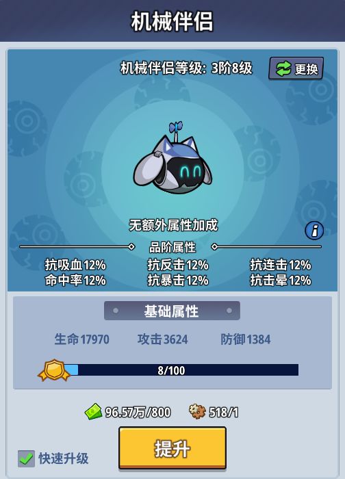 机械伴侣通过提供关键词条属性,增强你在战斗中的防御与反击能力。 词条属性:抗吸血,词条解释:减少对方的吸血百分比;抗反击,词条解释:减少对方的反击几率;抗连击,词条解释:减少对方的连击几率;命中率,词条解释:减少对方的闪避几率;抗暴击,词条解释:减少对方的暴击几率;抗击晕,词条解释:减少对方的击晕几率; 01机械伴侣培养所以为了提升该类型的词条属性,要持续对机械伴侣进行培