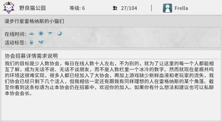 #星痕共鸣 少人数协会【野良猫公园】招新,目标是维持10人左右的活跃人口,让协会里所有人都能互相熟悉、成为朋友。欢迎感兴趣的朋友咨询