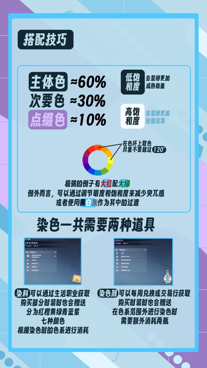 #星痕共鸣 目前游戏内不论是饰品还是套装或者单件外观都是可以自由染色的,染色的时候需要调色剂和染料两种道具,调色剂和染料都有许多入手方式包括生活职业产出,所以不用担心氪金问题。染料也分为红橙蓝绿青黄紫七种,具体需要根据你所染的色系来消耗,每次染色需要6个染料和调色剂,倘若染色范围在方框内只需要一个调色剂,反之则需要三个,且购买时装的话也会赠送足够你染完全部部分还有多余的染料。