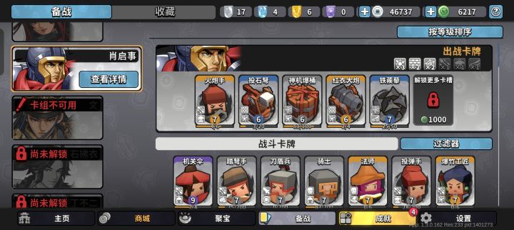 t0:绝对的好卡t1:能顶住前期或能守一路t2:多资源才能顶住前期或守一路t3:有特色有点伤害t4:没特色也没伤害紫卡t1:鸟铳手t2:一窝蜂 道姑 女巫 墨灵塔 剑客 御林(极难成型) 汉文臣t3:机关伞 方天戟手橙卡t0:红衣大炮t1:火炮手 11级法师(12级大削弱) 机关弩(难成型) 烟花大师t2:投石车 红袖伞 道士 松鼠 t3:吹箭 油车 爆竹工匠t4:墨将