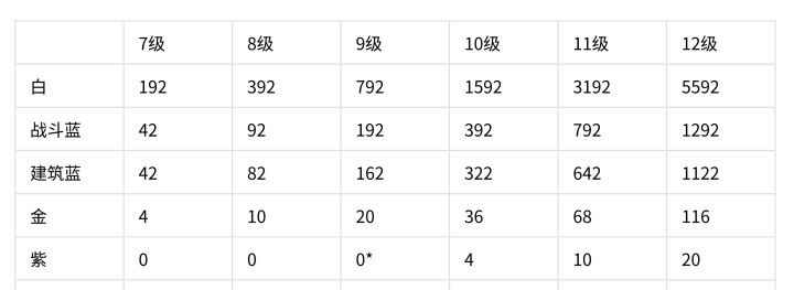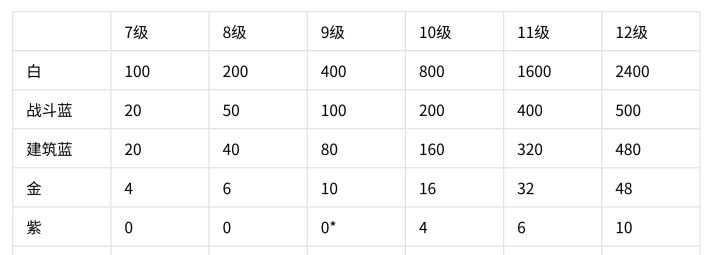 图1图2,每格代表上一级升到对应等级所需的卡牌数(*代表至少获得一张才能使用)图3图4,每格代表升到对应等级所需的总卡牌数