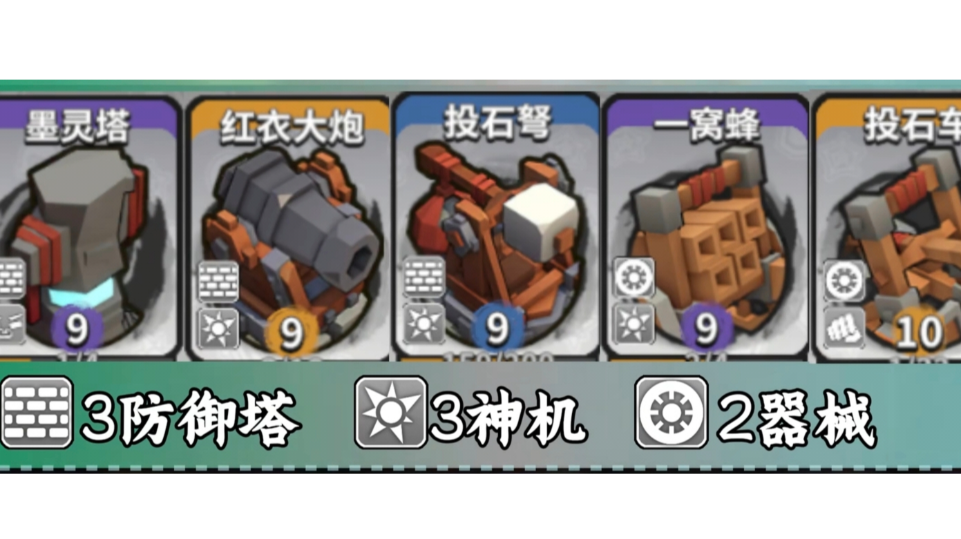 主流卡组为墨灵塔+红衣大炮+投石弩+一窝蜂+猛火油车/投石车阵容:这两套阵容都可,我会将局内增益列出,自行选择投石车或油车阵容思路:1.墨灵塔 由于我们经常需要墨灵塔站在前面,因此需要他保持一定的坦度,避免过早被摧毁,除非到了12级会自动复活。不然我们优先把他当前排用。这里需要注意拨浪鼓天赋,用之前需要看一下是不是我们所需要的。 在天赋里面优先拿绝世。普通天赋里可以优先拿黄公符,引雷针