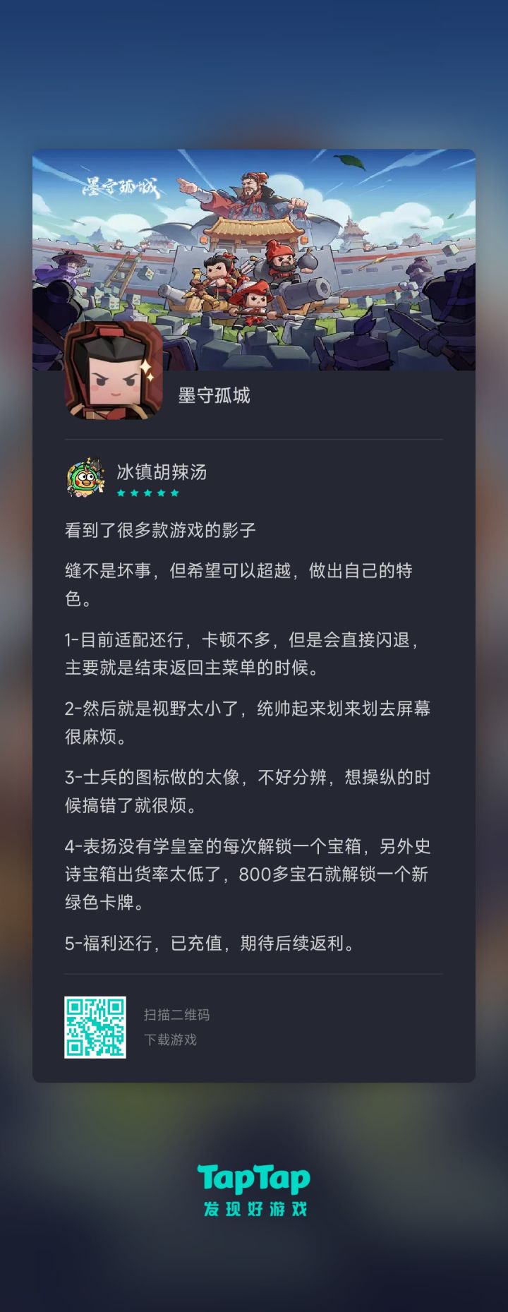 玩了几天 挺好玩的 就有几点希望能改进 :建筑无法移动,建筑拆除物资不返还。兵种羁绊加成太弱,搞得都是无脑堆橙卡。每局可用的兵种太少,就五个兵种 有的地图很难过每局的怪物波次有点点少 刚刚发展起来打完了无尽模式希望改成波次的 一直发展一直打的而不是打了几波次又重头开始以上是我的个人建议 希望采纳#浅评一下 #墨守孤城