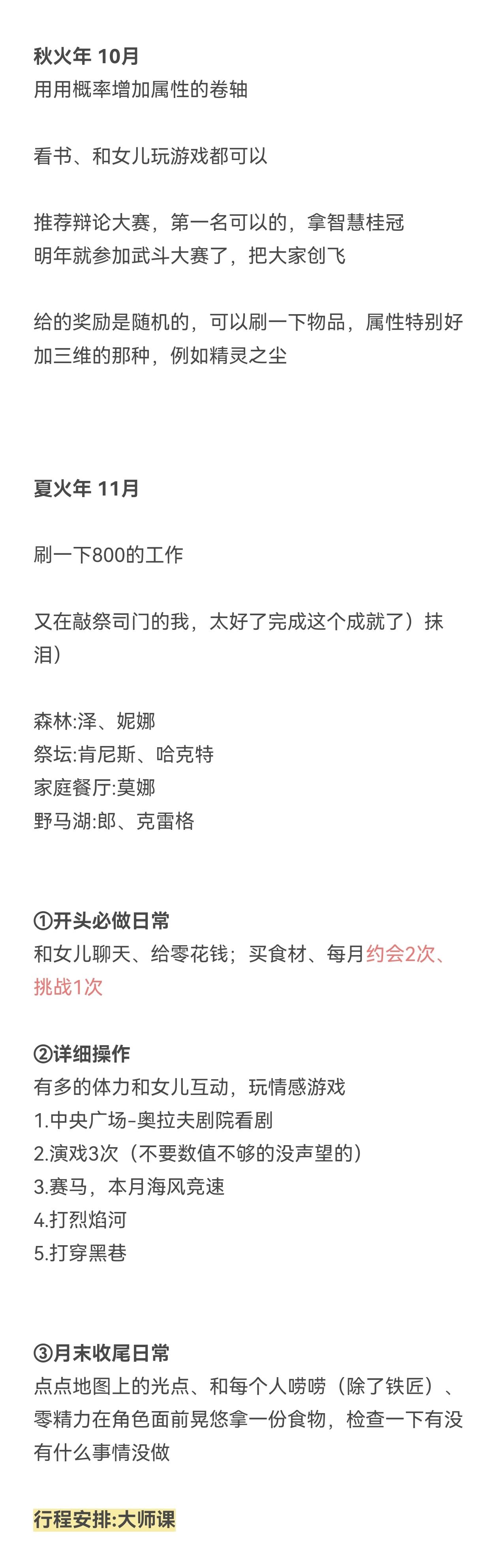 一、以身作则事件————第一个月:♥最有安全感(善良+博学):选3231,得48点♥最自豪(善良+厉害):选2123或2124,得46点♥最宠爱(善良+温柔):选1314,得48点————第二个月:♥最有安全感(善良+博学):选21,得24点,共计72点♥最自豪(善良+厉害):选32,得22点,共计68点♥最宠爱(善良+温柔):选13,得24点,共计72点————第三个月:♥最