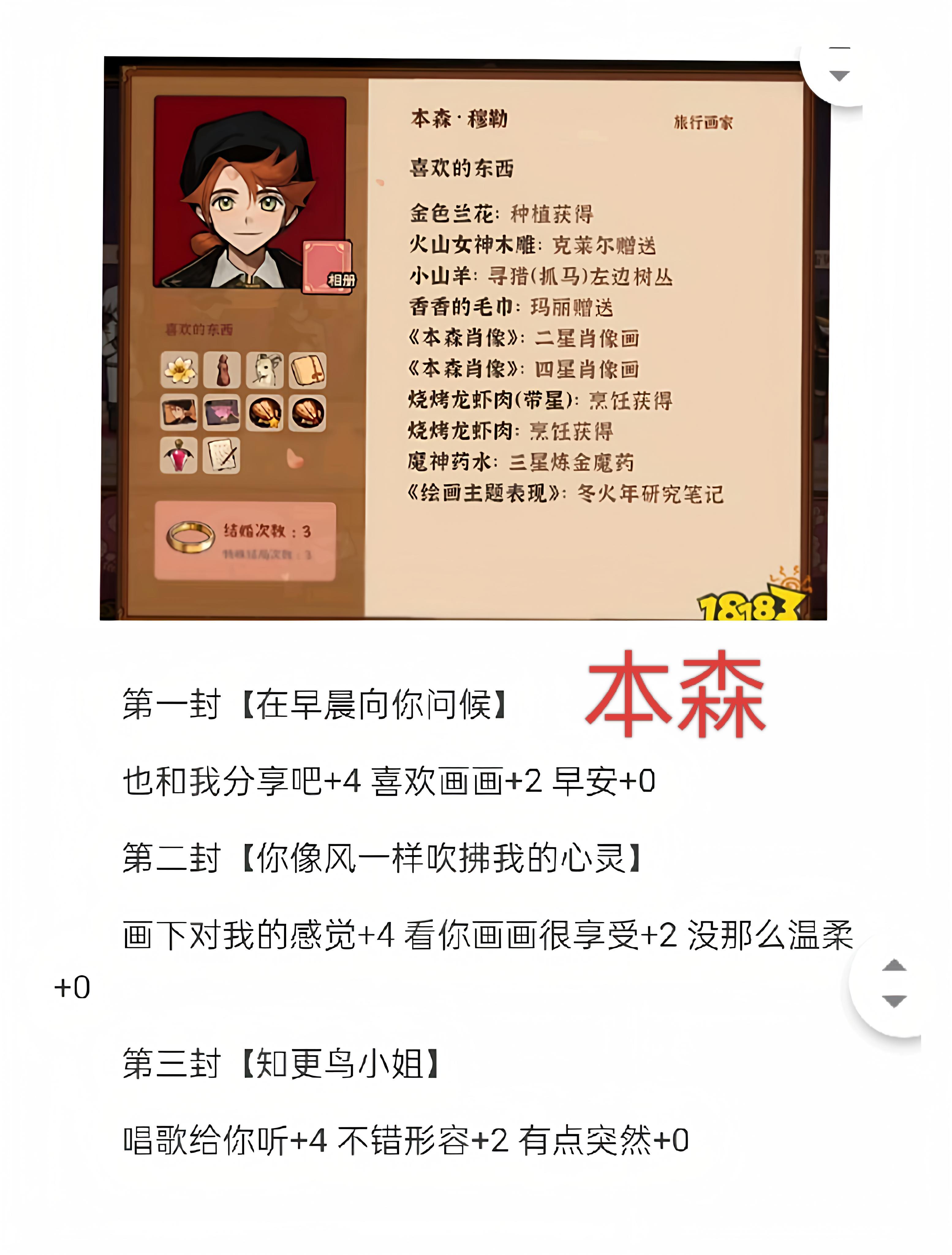 正经攻略来得还是太慢了,所以这里直接卡游戏小漏洞。【属性】最开始天赋技能先点在社交上(图三画圈部分)获得七折优惠,然后币都囤着,在后续商店八折活动的时候去铁匠铺,从铁匠那买化肥再卖给他,可以获得大量金币。后续就是接着买化肥加种地,做饭刷体力,再拿体力刷属性。如果觉得属性点不太好看(头脑,魅力,力量)可以去房间研究笔记,有概率刷出加成笔记(太麻烦了我没搞)【干劲】可以留意一下右上角设置旁的