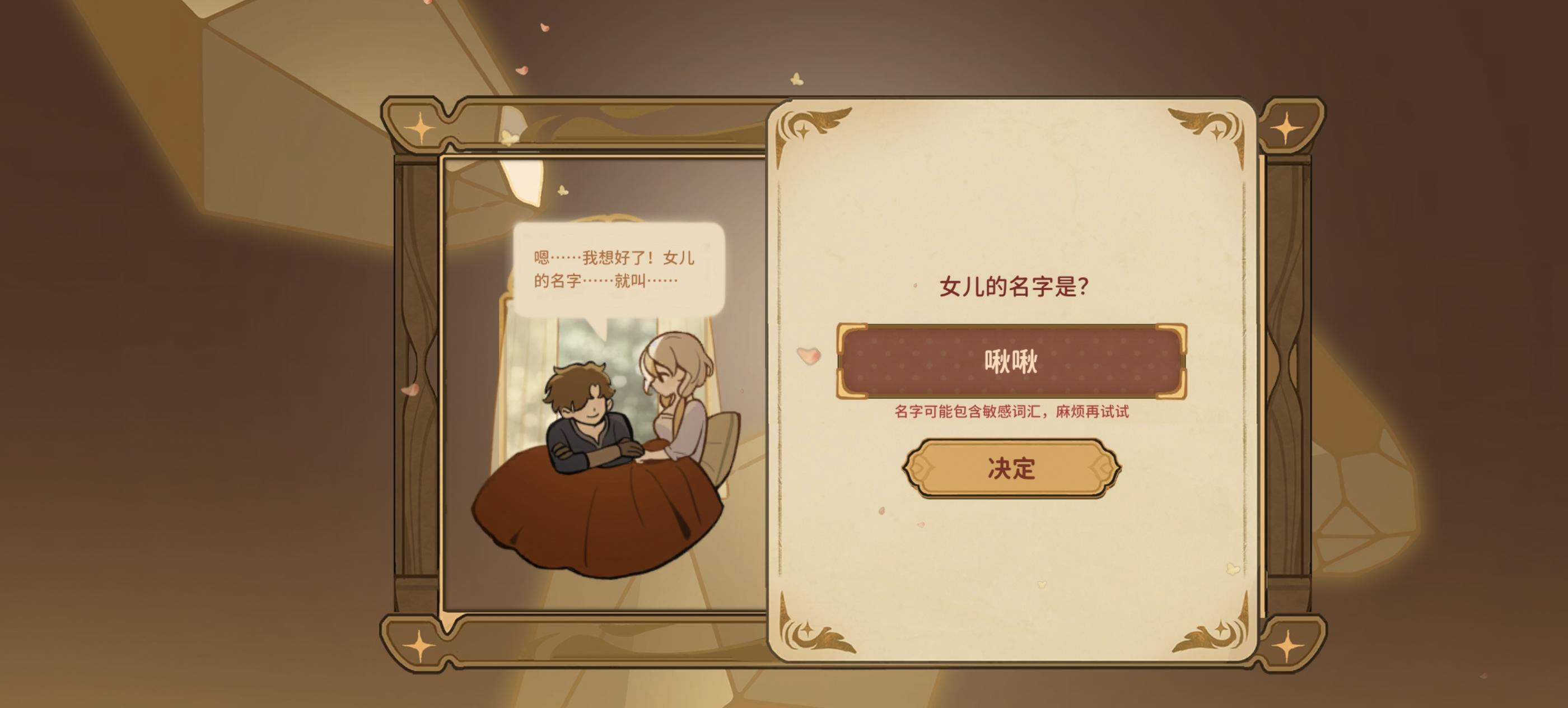 不要哇!我取名“漪宝”“忻悦”“柒月”“祺悦”“昕悦”等,全部无法生效!天呐!!词库不要这么空虚哇,那些好看却少用的词全没纳入词库,卡在取名已经很久很久了,当初测试的时候都可以用“漪宝”的,现在为什么不行了啊啊,显示敏感词,哪里敏感了啊喂!我妥协了,改成“啾啾”,还是敏感词!天呐!崩溃了哈哈哈哈(提示:前三张是手游,第三张是测试时的图,最后一张是电脑版的图)