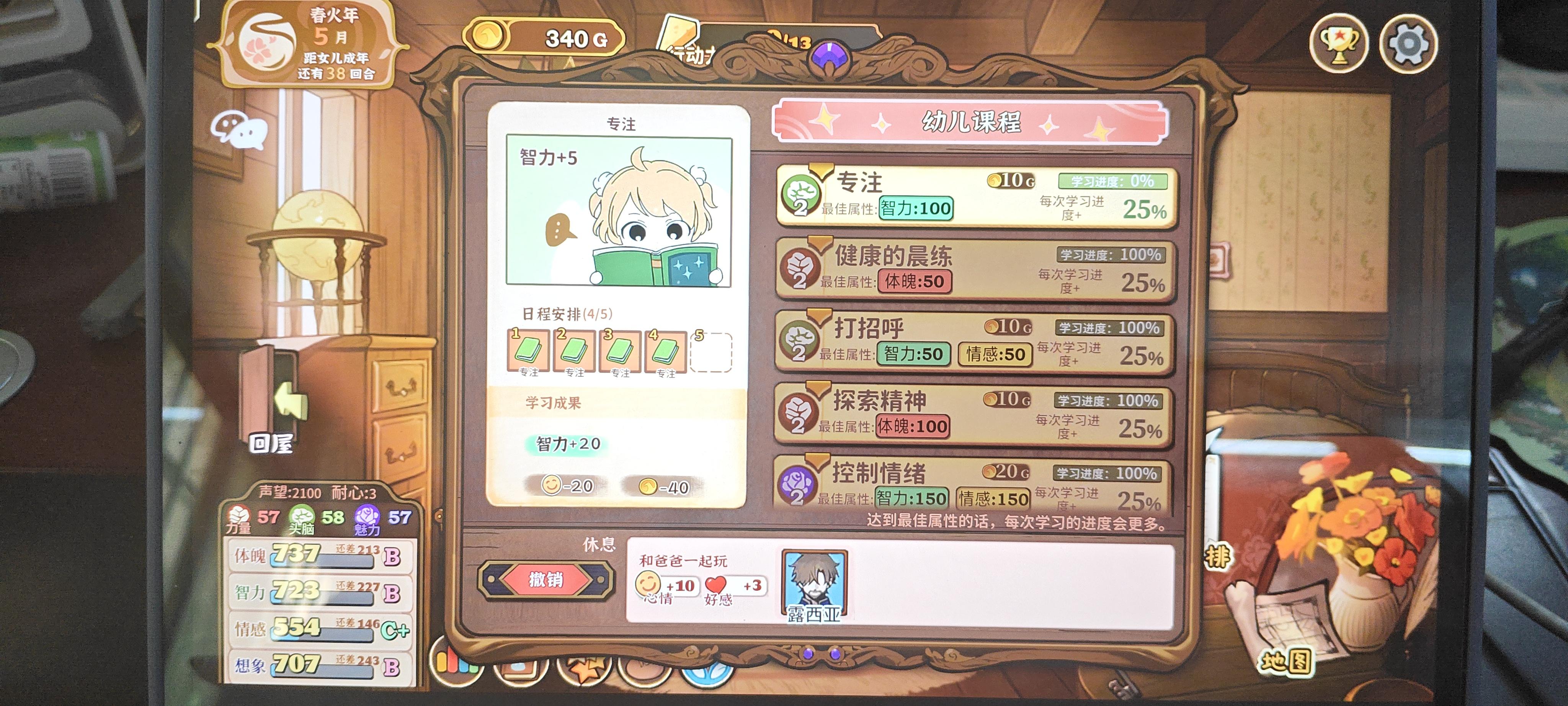 如图,之前玩一周目的时候,都是这个安排的课程,全部学习了就自动进入下个月,不过二周目属性高一点,最后一个课程安排4次就学完了,还差一次,没法自动进入下个月,还有啥其他操作吗?