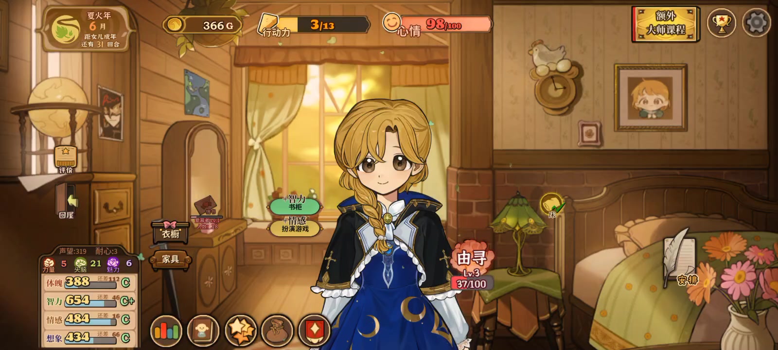 玩后感:先说优点:玩法丰富,人物多,剧情多,养成挺舒适的,虽然只玩到了14岁但是已经可以感受到整款游戏的诚意了!非常期待正式版!再说缺点:对话字幕太小,不适用手机,看起来很累;有一些游戏的按钮也太小,比如算数比赛,按快了很容易按错,觉得这些选项都可以适量改大一些!有一些玩法感觉略复杂,没搞懂,指骰子和赛马,猜想是不是多周目玩家的玩法,因为基础数值太低,14岁去什么舞会之类的完全没有胜算啊!其