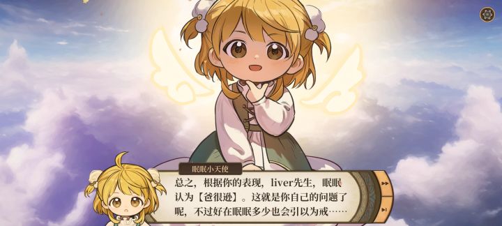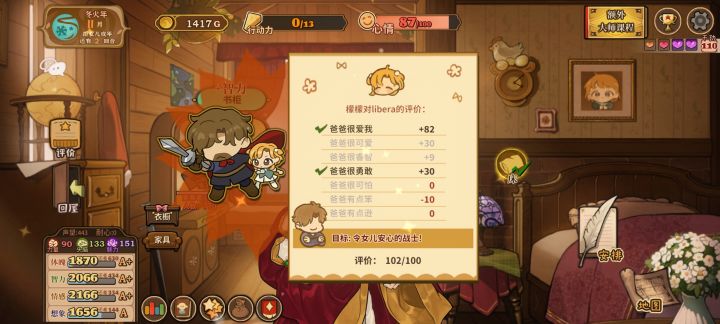一点游戏记录,随便玩的,不做参考hh第一周目,完全都不会玩,想点哪里点哪里最后得到【爸很逊】称号orz……第一周目的没存档真的很可惜了,那时候还不懂怎么存档……我的大女儿,眠眠,一周目因为老爸不会玩当了商人。第二周目励志于做一个好爸爸,拿到102分的高分本人也是非常得意,虽然不知道哪里扣了10分hhh。二周目檬檬是神官。三周目是二周目冬的某一月档重启,选了能选的最高星成就,檬檬成了世界首