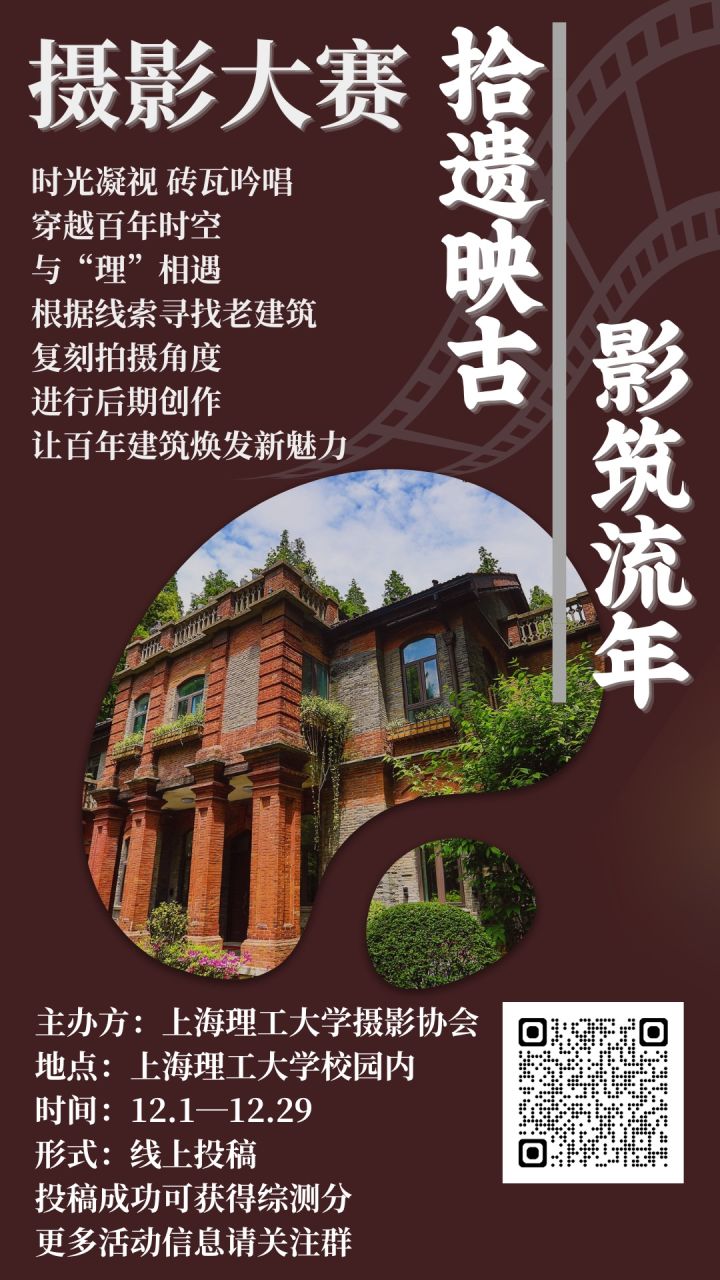 欢迎各位同学来参加「拾遗映古 影筑流年」摄影大赛,每期活动开始后,会发布两张翻拍的老建筑照片,参赛者需根据线索寻找建筑,复刻拍摄角度,进行创意后期并投稿。成功投稿可获综测1分。每期评选若干优秀作品上传校园网站并署名,之后120周年校庆可能会进行展出,还有机会获得稿费哦!优秀作品入选者可加获综测1分。最后,从优秀作品中挑选两幅作为优胜作品并颁发奖品!