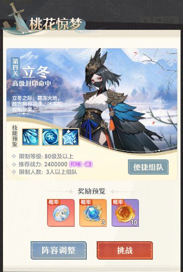桃花惊梦副本作为命魂的主要产出地是桃花师们的每日必刷副本而立冬本作为红品命魂掉落的难关更是让人既向往又头疼今天夭夭带来的就是立冬副本的通关思路一起来看看吧 01 副本简介桃花惊梦各个节气副本都有着对应的特色,立冬副本就以霜冻为主。打副本之前首先要了解一下副本的阵容以及一些特点,具体如下表所示:序号机制说明1立冬副本BOSS的特点为高级封印命中,小怪们分别是2个物理群攻特使、