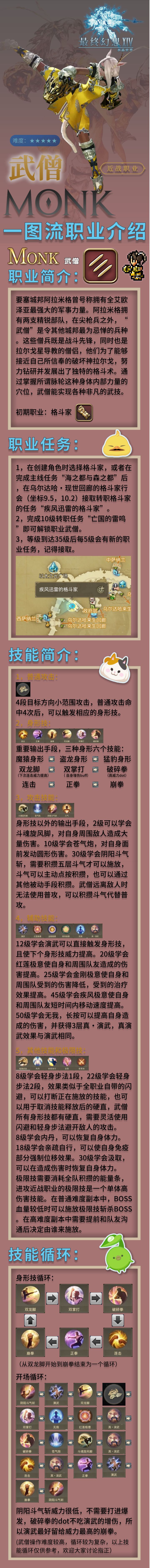 又要拼手速又要记循环还要看buff:演武—平a4接双脚—a4接双掌—a4破碎拳—a4无我—红莲极意—真演武—连击拳—真演武—正拳—真演武—崩拳—接斗魁旋风脚—苍气炮,循环结束续buff后面记不住了,我后面只会哪里亮了点哪里木桩都能循环上,高难副本脑子里根本没循环,只记得重要的崩拳要增伤,演武一定要留到最后。觉得副本没挑战的来玩武僧啊