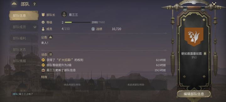 部队『朝如晨露暮如霞』后缀『梦幻』生产采集战斗摸鱼的都可以来,我个人大部分时间是在晚上八点之后上线。