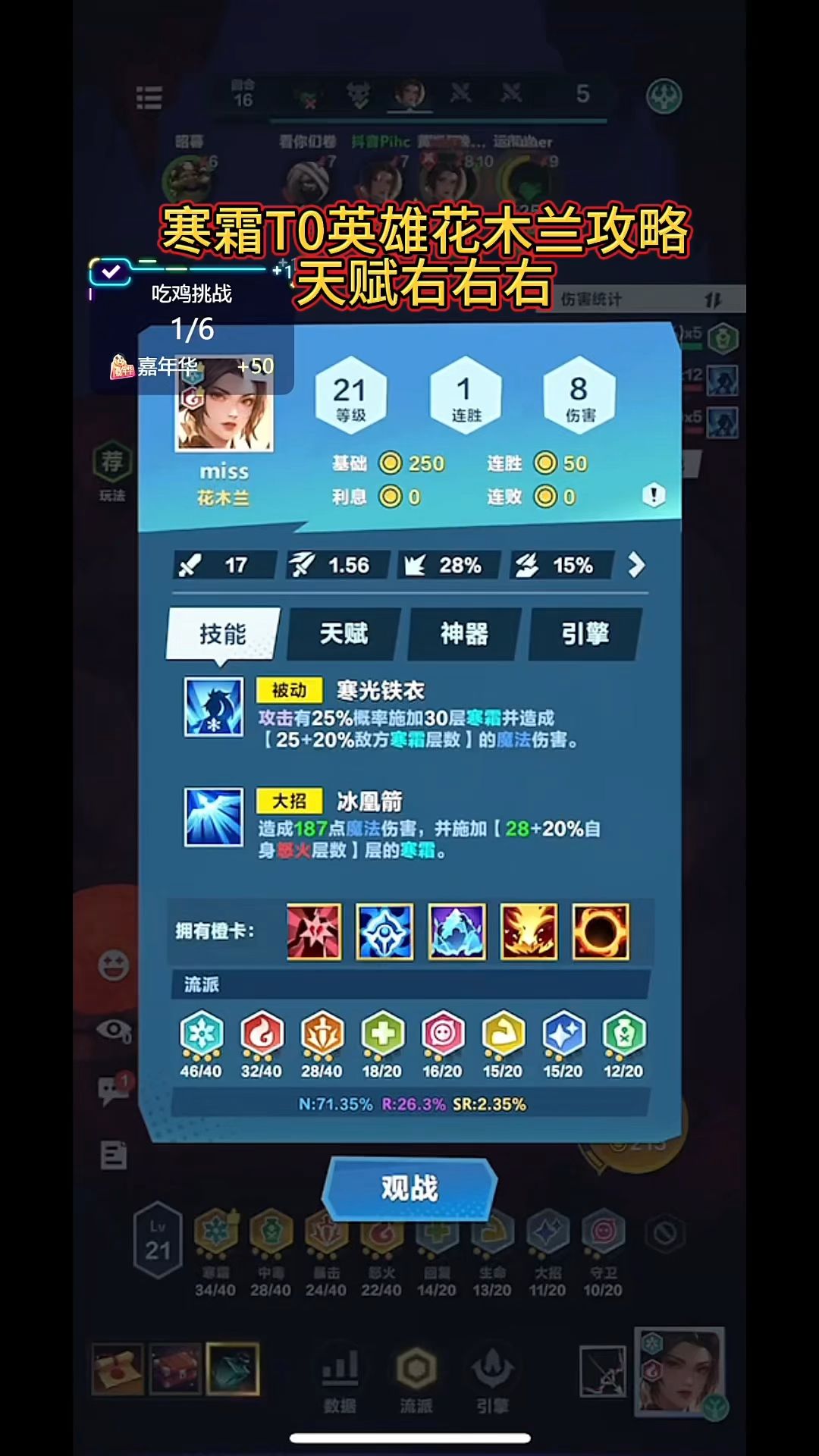 我个人极其推荐买“冰霜巨械”不仅仅是强度,还有它的价格仅8888金币。 英雄玩法介绍 推荐主冰副生命(天赋三个左)英雄介绍冰霜巨械拥有超高的爆发以及较强的前期强度,可以选择连胜。对引擎装备的需求不是那么依赖,因为自身的强度足够,即便没有好的引擎装备也不是没有吃鸡的机会,同等引擎装备的情况下也是无敌般的存在。英雄登场介绍最好在有“生命”没有“暴击、回复”的局去玩不然被触发起来还是很难受