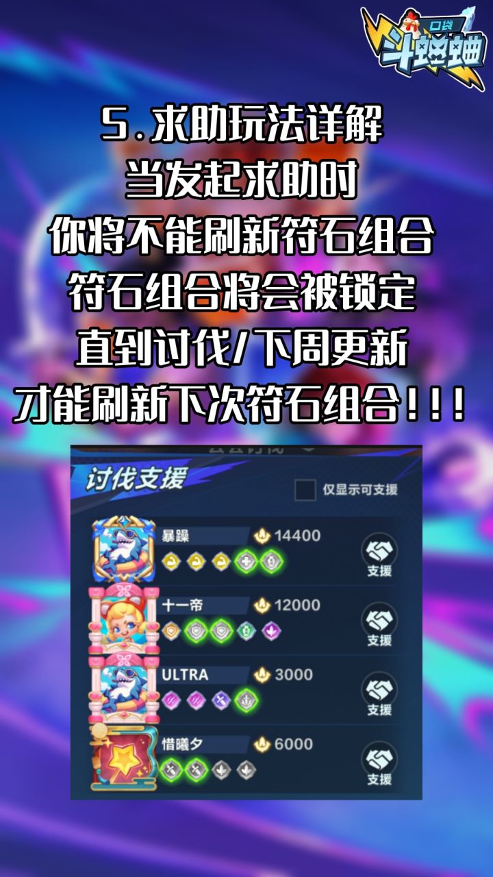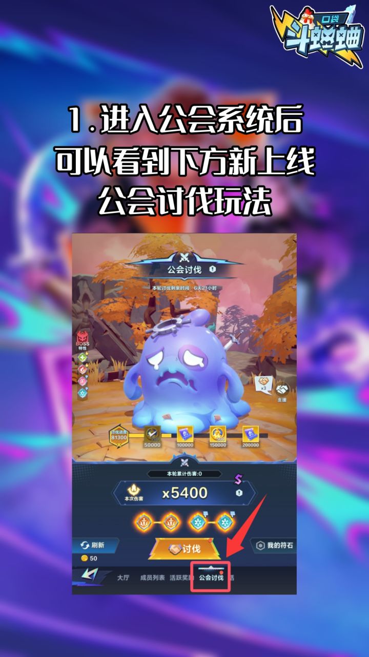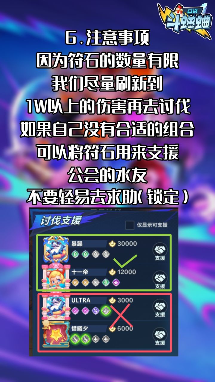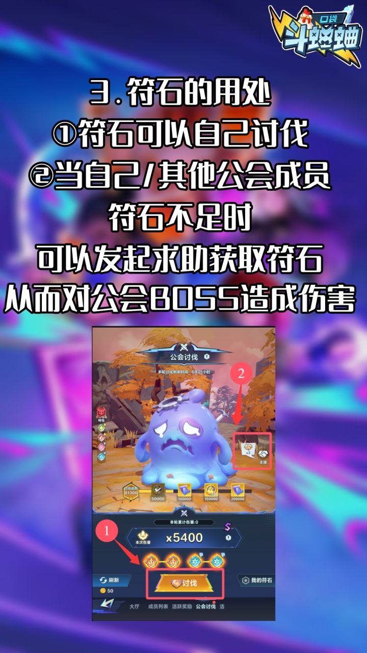 我是抖音斗蛐蛐主播:十三帝本期来讲一下口袋斗蛐蛐新上线的公会讨伐玩法个人感觉这个功能可以极大提高公会成员直接的活跃度(每日获取10个符石)总得来说 每个公会对BOSS的讨伐标准不同目前没有看到符石有会过期的说法 所以我建议大家尽量能控制伤害在1W以上再去讨伐比较划算自己刷新的伤害没有达到1万以上可以通过公会水友求助消耗掉自己的符石有什么更好的见解也欢迎在评论区下方交流#口袋斗蛐蛐攻