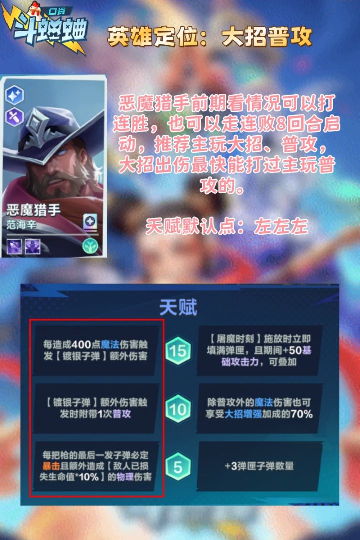 目前口袋斗蛐蛐内部已预制了游戏推荐以及玩家天赋+装备+拿卡的热门推荐全英雄天赋表相对来讲比较醒目,天赋推荐的都是常规天赋,玩家基本不会出错,玩家也可以选择使用游戏内置的热门推荐去应用天赋哦~#口袋斗蛐蛐攻略