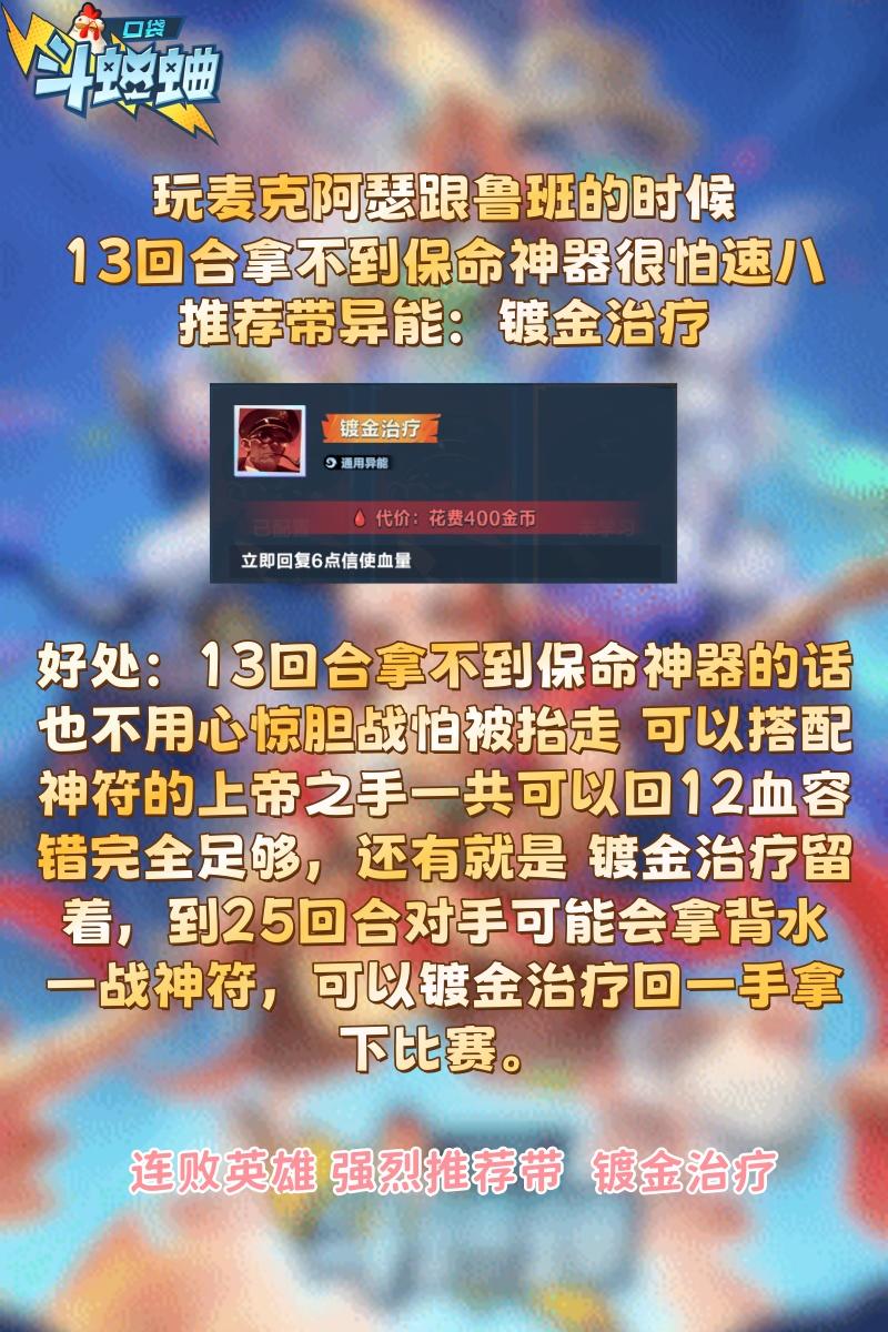 前期主守卫打连胜 比较稳。 10级或者来守卫双金可以异变。副回复流派。 连败起手可以5回合后可以选择直接异变,守卫加回复同时提升! 最怕的是闪避局导致自爆打不出伤害,最优解拉闪避! 赐福方面:优先经济任务,其次回复、守卫任务!例:“愈合季风”“自然治愈”… 克制方法:回复抑制、治疗抑制