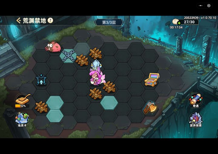 【战区:141】【账号:20533939】【昵称:赤乌玄兔未同宿】 太古禁地经验攻略首先荒渊禁地不需要走完百分之百,把进度的后七个奖励拿完就可以,幽都禁地可以尽量走满,因为整体奖励比荒渊禁地多。那么有个小窍门可以分享,两种禁地通用,首先新开图先走直线,先把三层都打开,直线遇到障碍可以先不点开,先点旁边的格子,绕过去,因为后面也要点开,早晚而已。三层全开之后,从第三层开始,先找石像,再找斧头