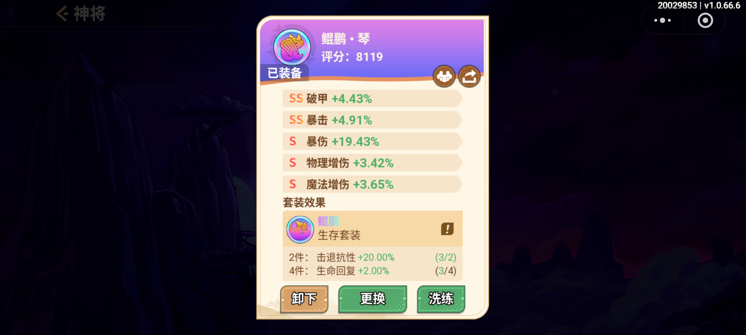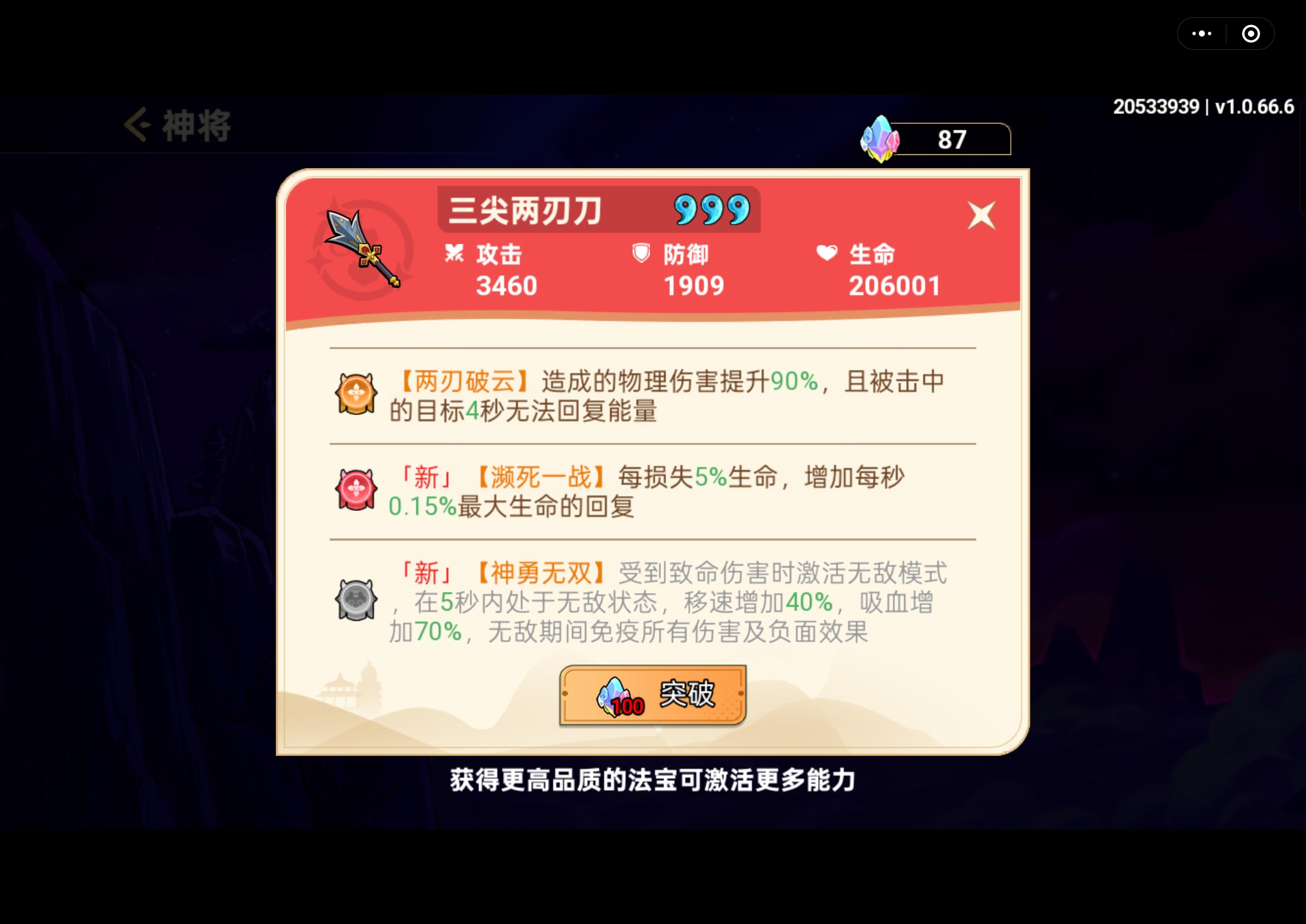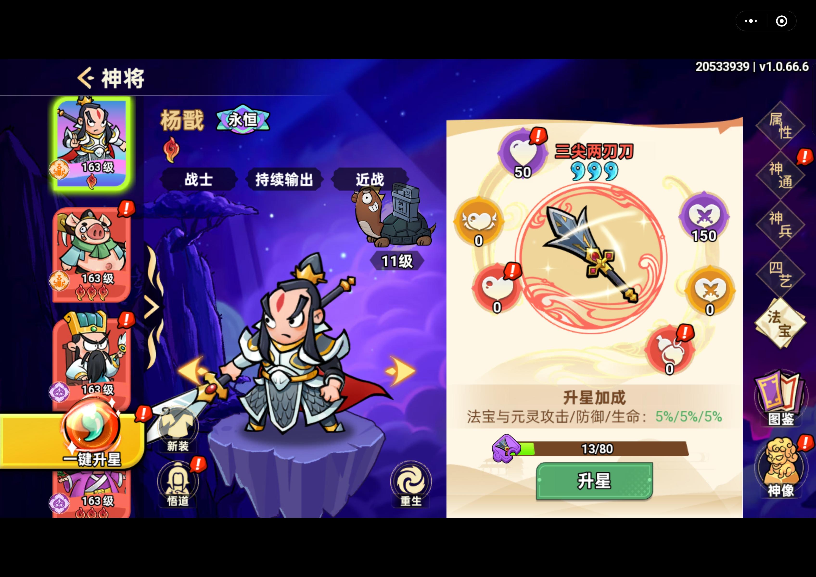 【战区:141】【账号:20533939】【昵称:赤乌玄兔未同宿】杨戬攻略一、神将分析作为橙将,最大的优势当然就是比红将升星更容易,商店也可以免费兑换碎片,前期零氪也可以轻松到12星,使用聚灵丹进阶为红色,加上有星级的优势,不比红将差。技能有打断和击退都效果,也有增加伤害的效果,属于半控制半输出的战士类神将,能控能打。二、法宝分析技能1【濒死一战】每损失5%生命,增加每秒0.15%最