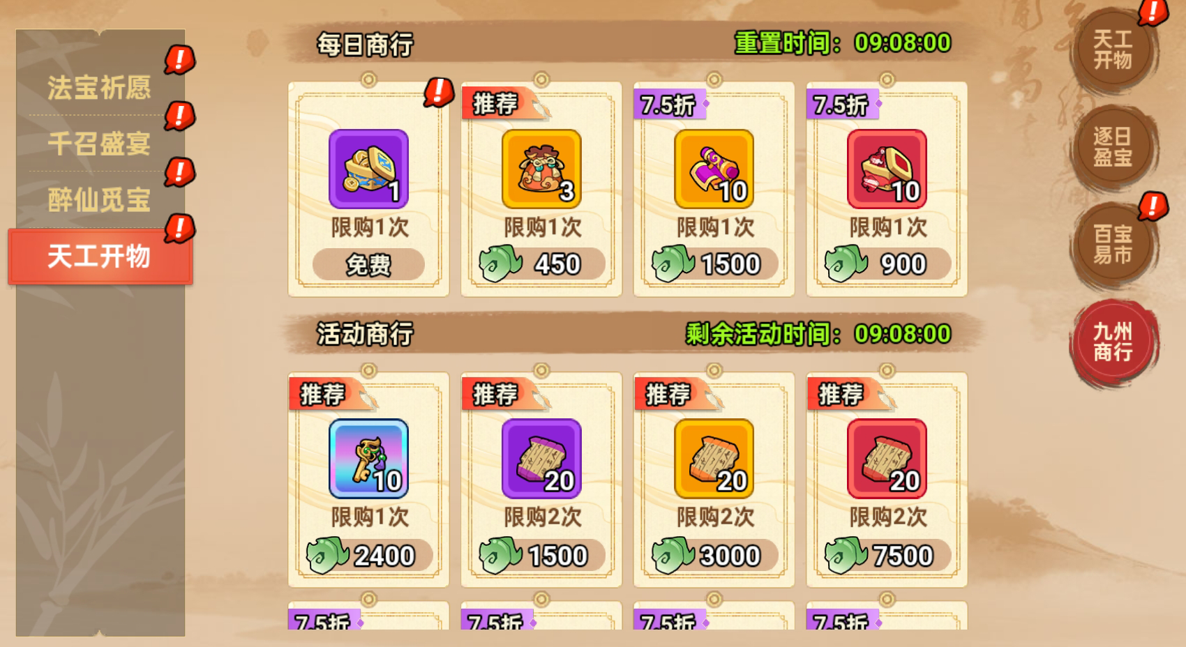 【战区:141】【账号:20533939】【昵称:赤乌玄兔未同宿】天工开物活动攻略此活动就是通过任务解锁活动格子,每横列与竖列任务全部完成解锁活动箱,活动箱可以领取材料包与随机法宝图纸,奖励很丰厚。其次材料还可以通过历练、仙盟占领、斗法获取,材料用来兑换道具。道具兑换顺序建议,前期(自选神将)=后期(8个悟道丹)>天穹珠>法宝灵珠>宠物幻灵笔。有几个诀窍就是,1.格子任务中有个任务是商店仙