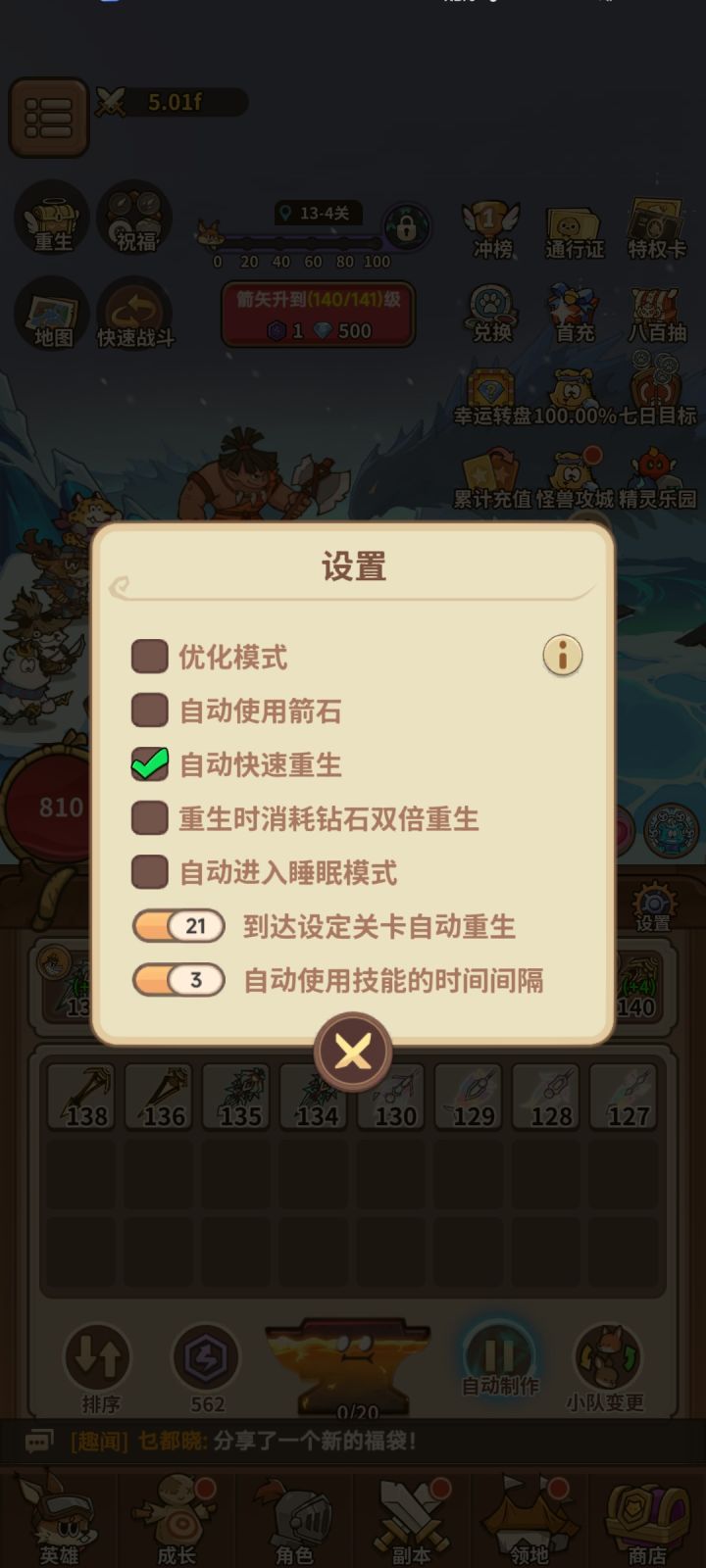 前期疯狂需要重生石和钻石提高箭矢等级。第一天就刷出了伏加特,看大佬们推荐就买了。现在在13大关,卡21节重生,效率是半分钟一次,1.25e的重生石和8个钻石。其实算下来挂一个小时就有1000的钻石,还有不错的重生石头,结果就是现在重生石升级要海量。。。不过这个效率比前期的钻石工厂好多了,毕竟现在任务卡在箭矢等级上,BOSS又打不过,所以算下来,一小时1000还不错了。重生石的多少取决于第几大关
