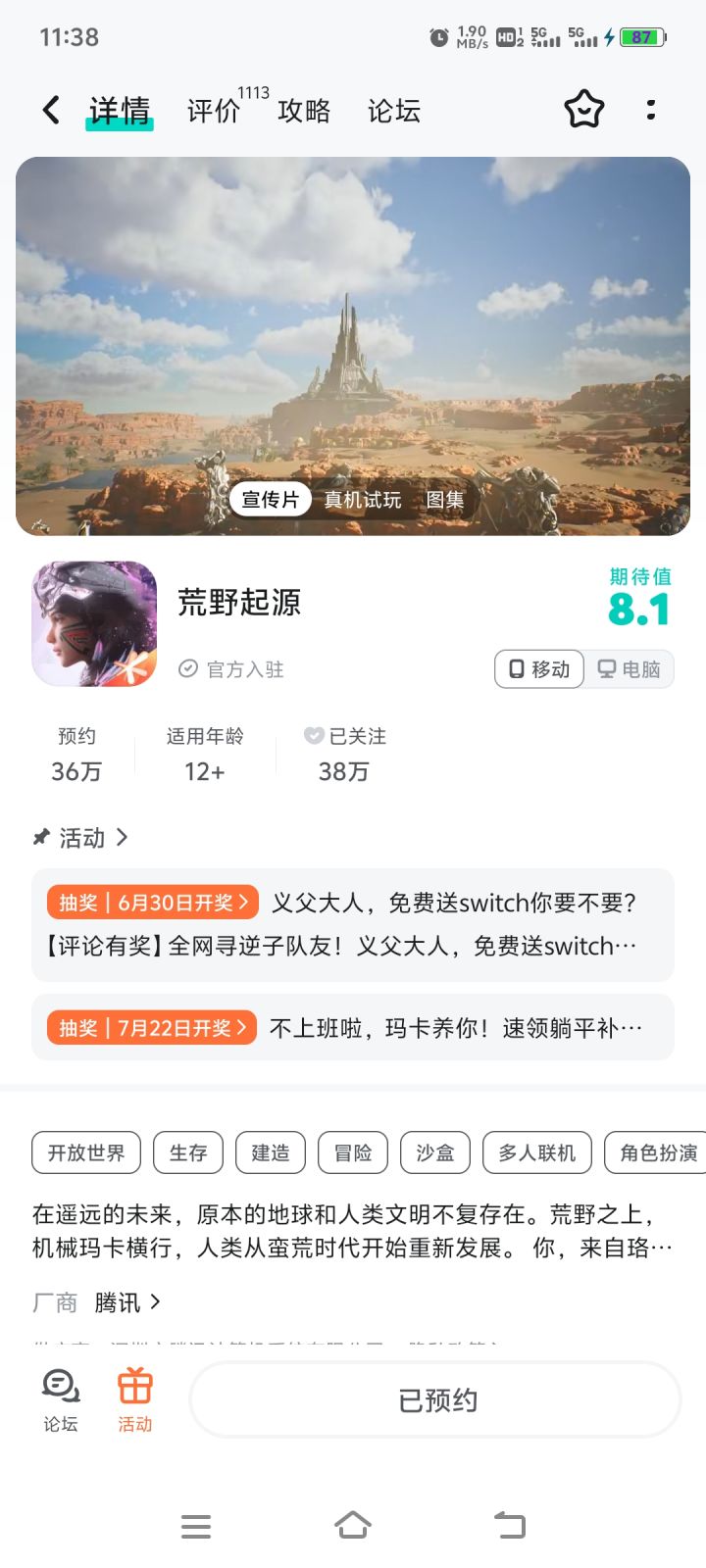 #荒野起源二测 作为一个忠诚的沙盒类、多人生存建造类游戏爱好者,无论是端游、手游游玩时间都是1000h+,对于荒野起源的期待还是很高的,也有幸参加了这次测试,先说下整体评价吧——优秀但不算顶级,优秀就不细说了,主要是讲讲需要优化的地方或者说是自己对于游戏的一些期待1.升级方面,这次测试感觉整体的升级节奏被限制得很厉害,想要快速升级必须跟着任务活动走,但是这种游戏应该更多的是探索冒险,野外拾取、击