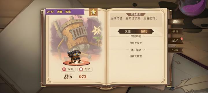 【图鲁·铁肩】角色介绍: 图鲁·铁肩是一名来自深渊的守护者,它是一名近战角色,拥有顽强的生命力和强大的防御能力,是队伍里的防御担当,有它在场上,会令人感到安心可靠。天赋技能: 无,图鲁·铁肩自身并不带任何的天赋技能。