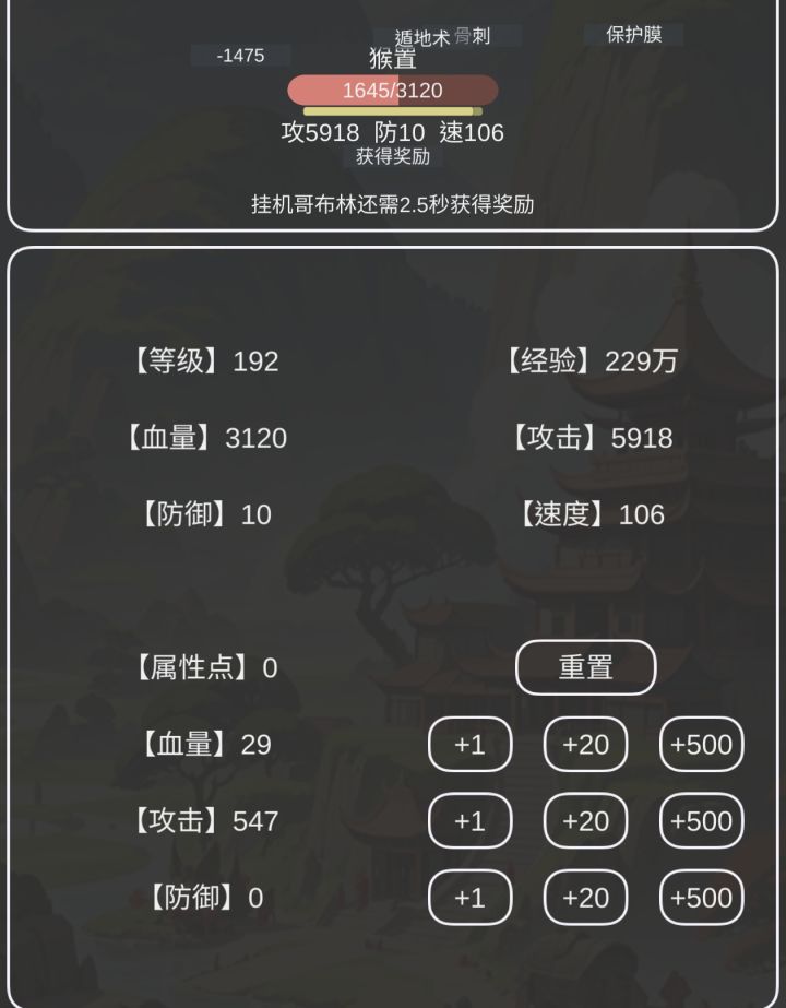 防御防御点540点。以后其他全部点攻击,只要初始攻击到4600就可以了打完大概在110秒左右秒,收益会多一倍还是可以的。技能要带舞动和小妖,其他都是常规技能
