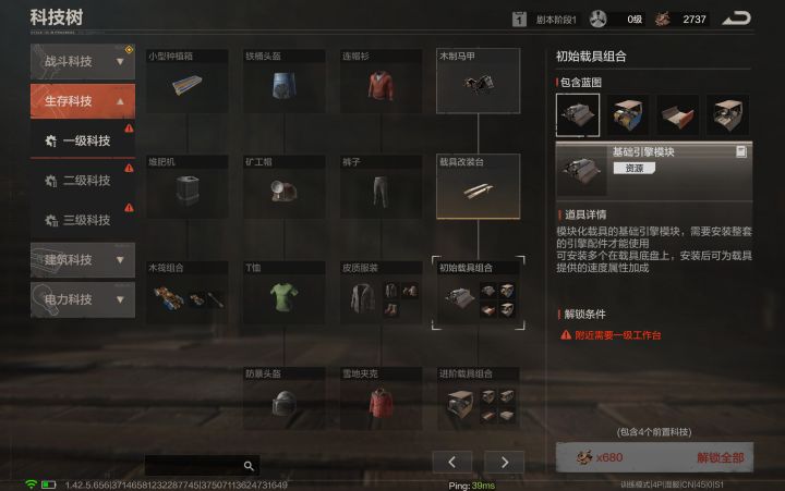 萌新开荒思路讲解!30秒入门! 首先是开荒步骤:砍树建家→跑资源点→点科技→跑矿升家 咱们一步步来 1、砍树建家:首先需要至少34000的木头,领地柜1000,然后造一个火柴盒【2X3】把领地柜拍上。建家选址要在资源点附近【其他视频有讲】,比较平坦空旷的位置,因为后期咱们需要扩建,如果位置太狭隘、起伏大或者太靠近资源点,都会有影响。之后造几个箱子,把剩下的木头放领地维护。进行第二步 2、跑资源点: