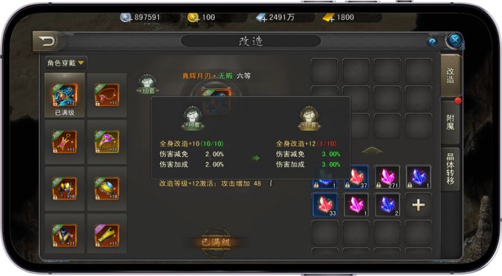 【装备改造简介】装备改造是游戏内提升装备战力的最佳途径,全身装备改造到对应等级后可激活改造等级套装效果,获得额外属性加成,改造等级不与穿着的装备绑定,装备更换后可进行晶体转移,将改造等级转移到新的装备上。【装备改造功能详情】1、改造需要消耗劳尔晶体和游戏货币进行改造升级操作;2、人物可穿戴的10件装备都可以单独改造,改造后可以增加装备额外属性,改造等级越高,带来的属性提升越大;3、全身装