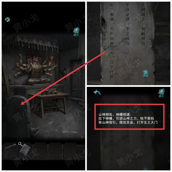 长期更新各类解谜游戏攻略,求点赞关注评论~~~1、点击桌面获得符纸,用来驱散墙上的眼睛,获得钳子2、使用钳子打开笔记本,获得铁丝,根据桌面上蜡烛最高,第二是暂时空白,第三是苹果,第四是元宝的顺序,推动墙面上的四个机关,打开石门3、进入石门右边的棺材屋内,打败怪物,右边获得晾衣杆,推开中间的棺材板,看见六个奇怪的符号,使用晾衣杆按照顺序拉下招魂幡,佛像手上出现一个盒子,使用铁丝