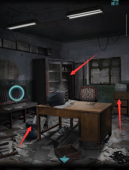 1. 点击书柜,获得绝缘胶带和玉佩,点击右边柜子第一个抽屉获得白纸,垃圾桶里有物资单2. 点击走廊左边的门,左边有装钥匙的盒子,使用钥匙开门进入,右边有个箱子,上面有数字和符号,和物资单的信息相似,根据物资单的信息解开盒子密码,获得另一枚玉佩,打开下面的抽屉获得铅笔,左边的箱子里获得电源线。3.办公室桌面上的报纸拿走,使用铅笔和白纸拓印处桌面的图案,根据拓印的图案重新摆放书柜上的书,获得录像带