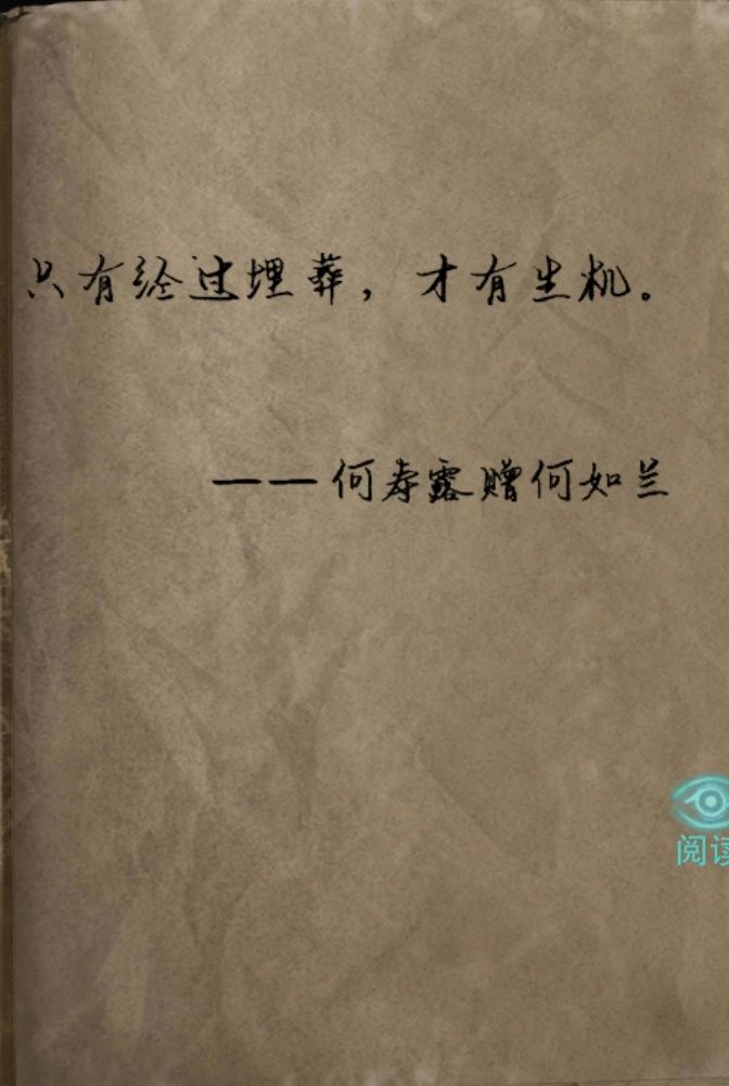 1. 乱葬岗获得铲子,使用它铲掉地面上的土,看见一个棺材,点击何极画墓碑上的罐子,敲碎可获得何长玉的石块2. 进入墓园,将除了何无棋,何无琴以外的其他人的石块都拿掉,根据他们的碑文重新放置,发现墓碑发生了变化,何无棋(1)、何无琴、何寿露(3)、何长玉(2)、何极(白色)秋、何长酒(4),根据稻草人上的词设置左边墓碑的机关,获得一张面具,将面具戴在稻草人脸上,获得一把伞,打开伞,看见内部有图案。