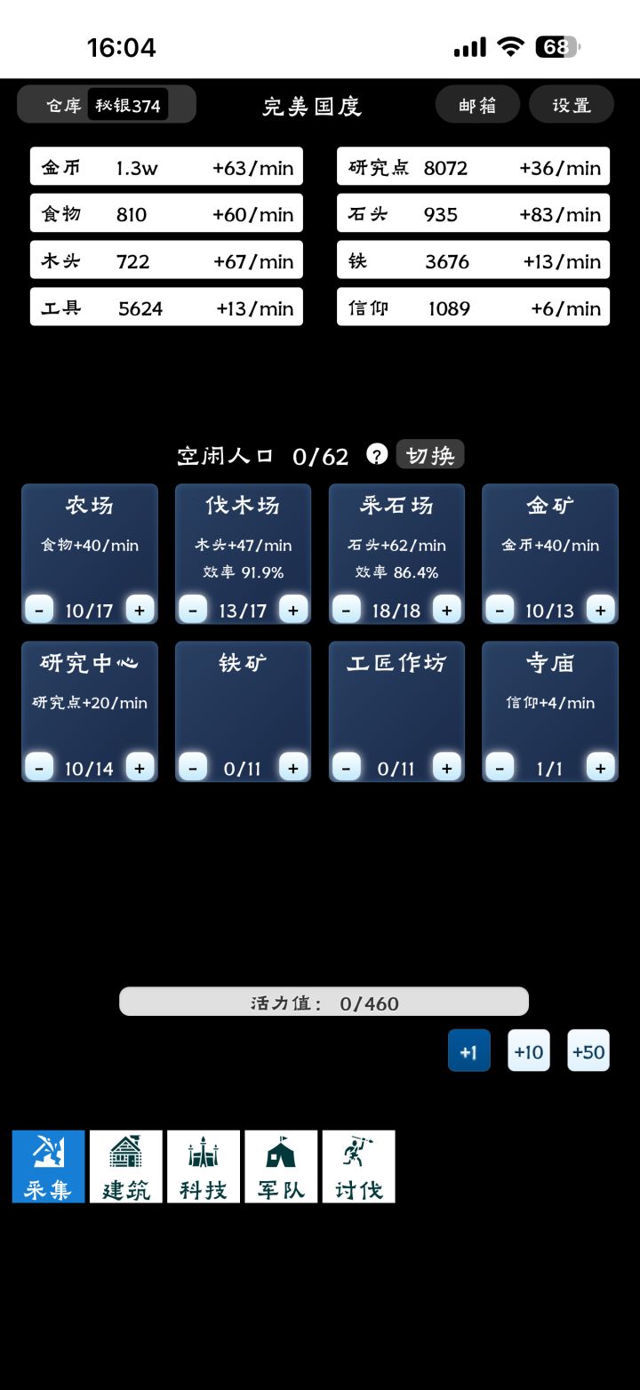 玩家ID:fz2a4513324前排提醒:本游戏节奏较为缓慢,适合喜欢策略和长期规划的玩家,入坑前请做好心理准备。军功在此游戏非常重要,不要用军功刷新兵营,先屯1000解锁中级兵营。开局按新手提示即可,会逐步解锁采集,建筑,科技,军队,讨伐,国度,征战。采集人口效率:每个人口提升4资源/分钟(研究点为2/分钟)。效率衰减:同一建筑内人口超过10后,效率逐步降低,最低为60%(38人