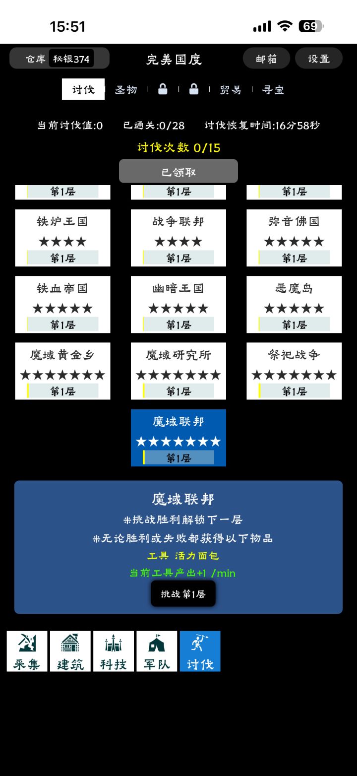 1. 先说结论 此方法讨伐可以在前期比别人讨伐多10倍的资源量 首先讨伐是赢了输了奖励都是一样的 且半小时会增加一次讨伐 看到上限就直接打 金字塔保底20金币 魔域联邦保底20工具和俩面包 工具前期也需要相当于凭白比别人多两个面包 活力点加资源是根据资源建筑等级来的建议前期加木石食钱 第一天直接领取10面包军功快速发育2. 结论 层数是6 11 16 以此类推才能额外加一点资源产出 第一层不加从
