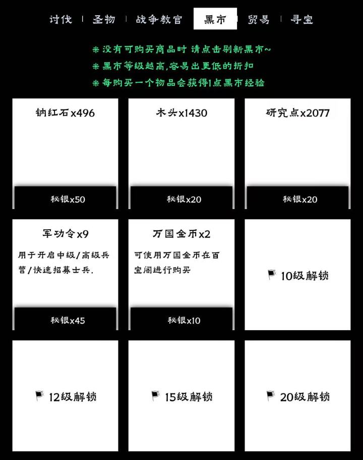 先放结论及建议百宝阁,购买物品消耗万国金币。优先买令牌(银月、战争),其次星光阵法后四种的碎片(北极、天狼、牛郎、织女,没法通过征战国度稳定获取)。不要买军功不要买军功!!!原因后文解释神秘商人,购买物品消耗秘银及各类资源。可以秘银换取军功(6秘银=1军功),也可以用多的暂时用不上的资源换取急需资源。黑市,购买物品消耗秘银。可以买军功(5秘银=1军功),其次后五排圣物碎片(洞悉、崩山...无