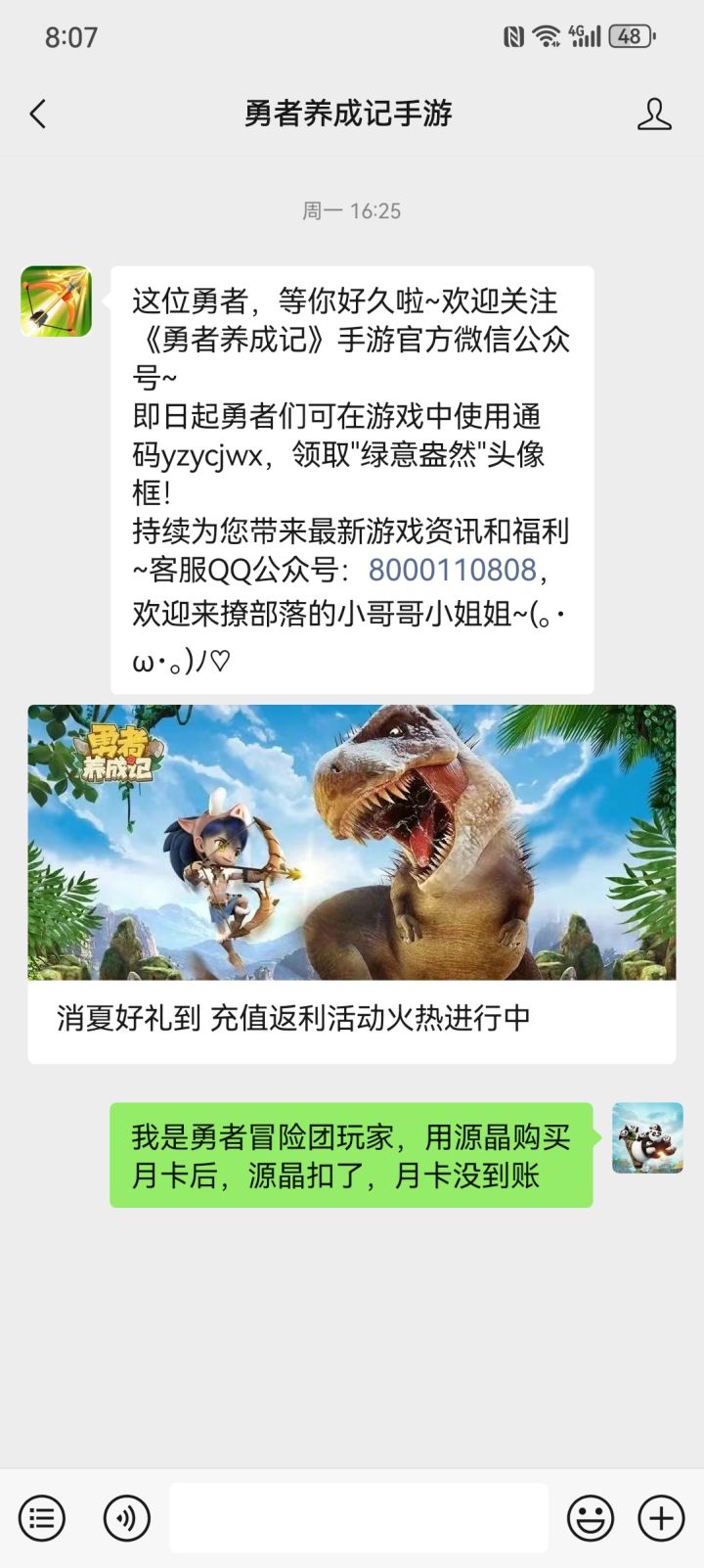 进游戏卡了一下,用源晶买了月卡,结果源晶扣了月卡不到账。游戏里反馈了三天没反应,根据客服说的去找公众号,过了三天还是没反应我是微氪玩家,每周几百。现在可以省下了。