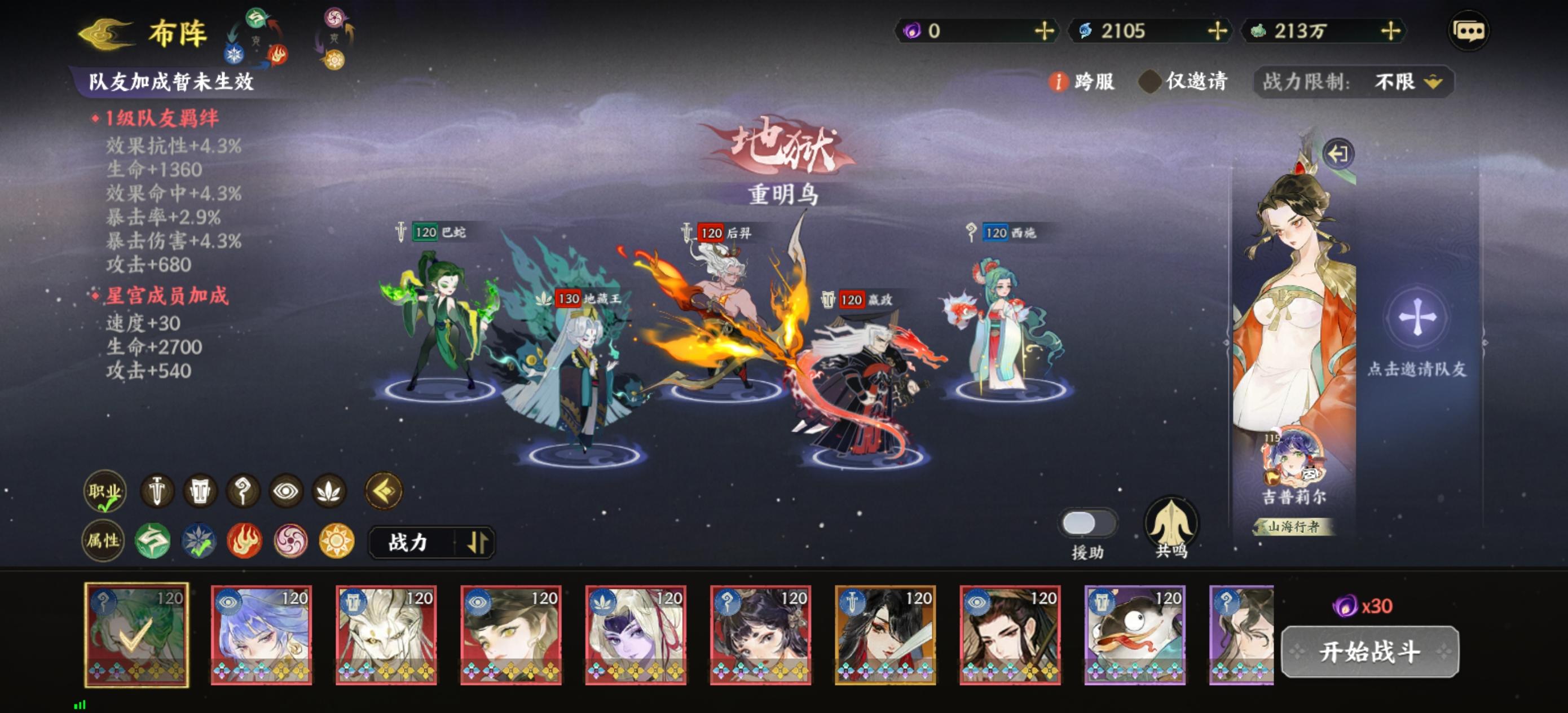 试了几次白无常,但总是翻车。建议过不去的小伙伴带个北狄,穿三生命避免暴毙,然后一直普攻巫咸,百分之五十几率挂两回合禁疗。完全没必要点天命五,练度高的可以带两速度一生命。两回合的禁疗新debuff能够覆盖一回合的禁疗。其他人集火巫咸,留能量抬血避免被杨戬秒。甚至可以带两治疗,轮流抬血。感觉两攻击一生命的桃姬比五星地藏王更适用于这个关卡。五星猴子,四星陆吾,四星西施,六星桃姬,四星北狄。第一次