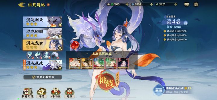 想打高分上等马夹击后羿去打最难的嬴政,其他三个就需要考虑了,刑天就固定是负面队了(其他都没负面队伤害高),鲲鹏因为没c了先随便混一下,等我有钟馗再考虑凹鲲鹏,龙女很好解决,及时清负面和两个aoe清小怪就可以了